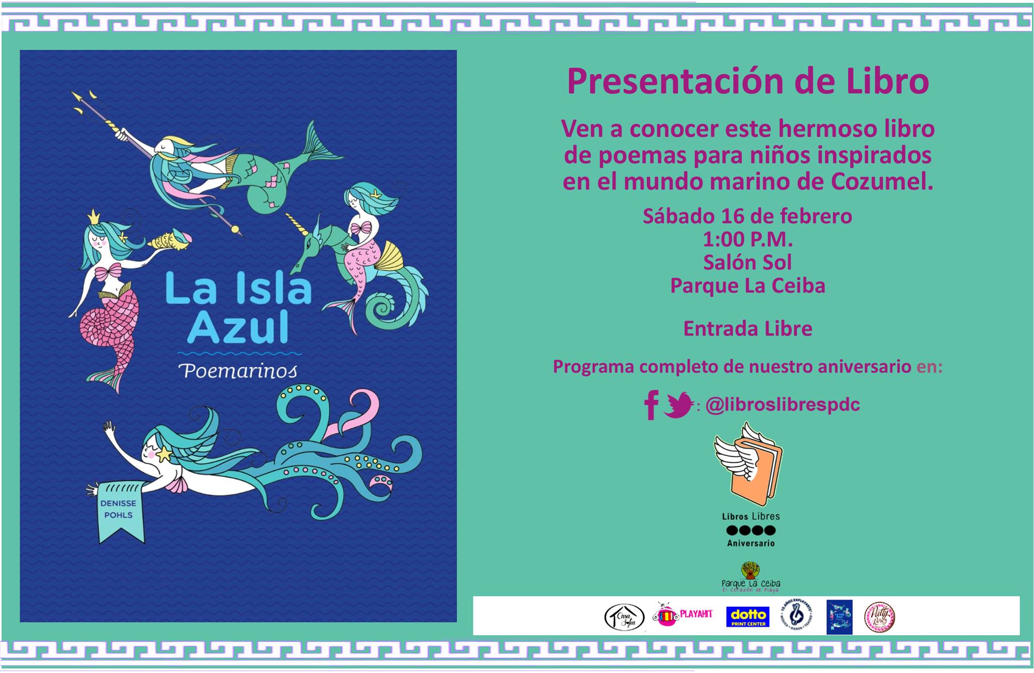 13:00 horas – Presentación del Libro “La Isla Azul, Poemarinos”, Libro de poemas para niños, organizado por Libros Libres. Parque la Ceiba. Entrada libre.