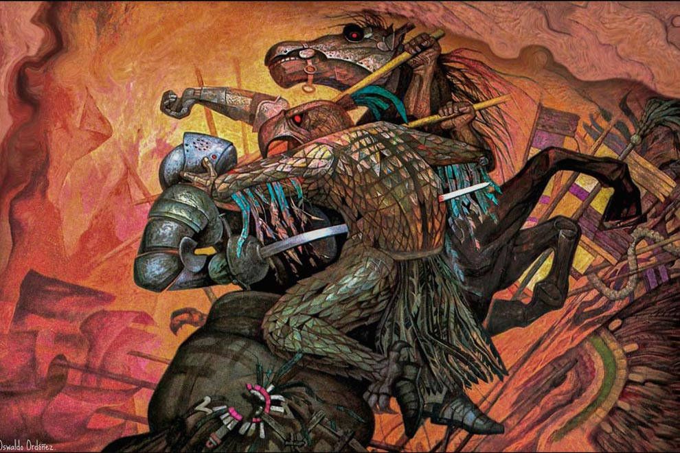 En la cuarta sección, Rendición, hay un boceto (del muro sur), para los murales de la Biblioteca Central de Juan O’ Gorman; sin duda, El centauro de la conquista, de David Alfaro Siqueiros, emplaza a los espectadores a interpretar cuánta fuerza humana fue desbordada en este hecho histórico.