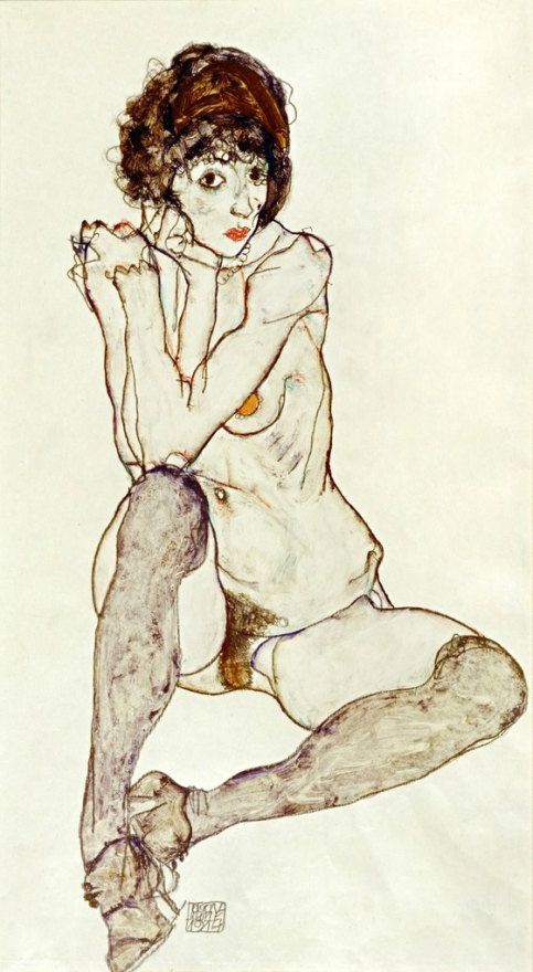 Todo ello aparece constantemente desarrollado de forma orgánica y psíquica en la obra de Schiele a través de la erotización de los cuerpos femeninos: véase, por ejemplo, en Seated woman with elbows on knees, 1914. En el dibujo, la modelo mira tranquilamente al observador con los genitales al desnudo; el color rojo que marca las zonas erógenas del pezón y de la boca, junto con la ausencia de decorado que conduce toda nuestra atención hacia la figura erotizada, nos deja entrever sin prejuicios las fuerzas instintivas que originan tal composición, y que a la vez podrían tener su origen en deseos sexuales reprimidos durante la vida infantil.