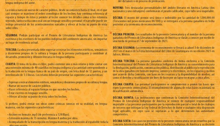 En esta novena edición dedicada a la crónica, podrán participar las y los escritores de los pueblos indígenas del continente americano, sin importar su lugar de residencia actual. Su obra deberá expresar o recrear los elementos estéticos, semánticos y discursivos propios de su cultura y lengua y contribuir al desarrollo, promoción y difusión literaria en lengua indígena.