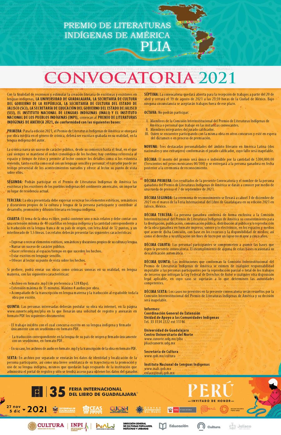 Con el propósito de reconocer y estimular la creación literaria de escritoras y escritores en lenguas indígenas, se anuncia el lanzamiento de la novena edición del Premio de Literaturas Indígenas de América (PLIA) 2021, en el que participan la Secretaría de Cultura del Gobierno de México, a través de la Dirección General de Culturas Populares, Indígenas y Urbanas (DGCPIU) y el Instituto Nacional de Lenguas Indígenas (INALI), así como la Universidad de Guadalajara, las Secretarías de Cultura y de Educación del estado de Jalisco y el Instituto Nacional de los Pueblos Indígenas (INPI).