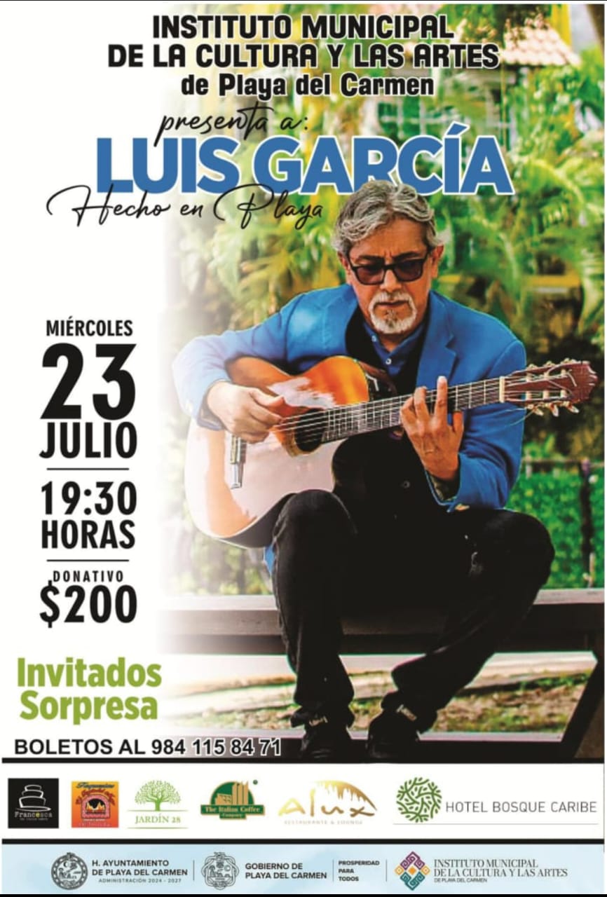 Playa del Carmen, Quintana Roo, 22 de julio de 2025.— El Instituto Municipal de la Cultura y las Artes de Playa del Carmen presentará este miércoles 23 de julio el concierto “Hecho en Playa” del guitarrista Luis García, un evento que promete una velada íntima y llena de talento local. La cita es a las 19:30 horas y el acceso será mediante un donativo de 200 pesos.