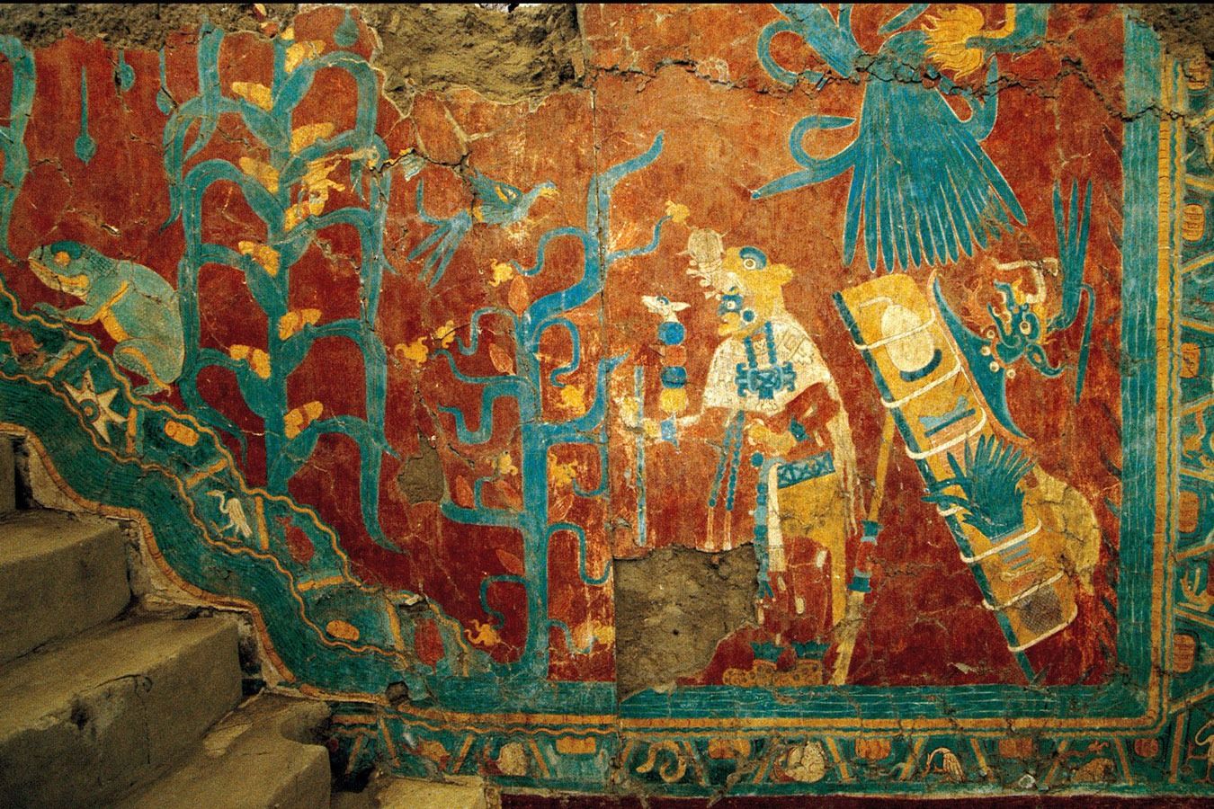 Este mural, ubicado a un costado de la escalera ascendente del Templo Rojo, plasma una escena en la que se ve representado un anciano que porta orejeras, pulseras, un collar, sandalias, manoplas y piel y tocado de jaguar. A sus espaldas lleva un cacaxtli que contiene un caparazón de tortuga, plantas y otros objetos. Además del hombre fueron plasmadas plantas de maíz cuyas mazorcas poseen rostros humanos de características consideradas mayas.