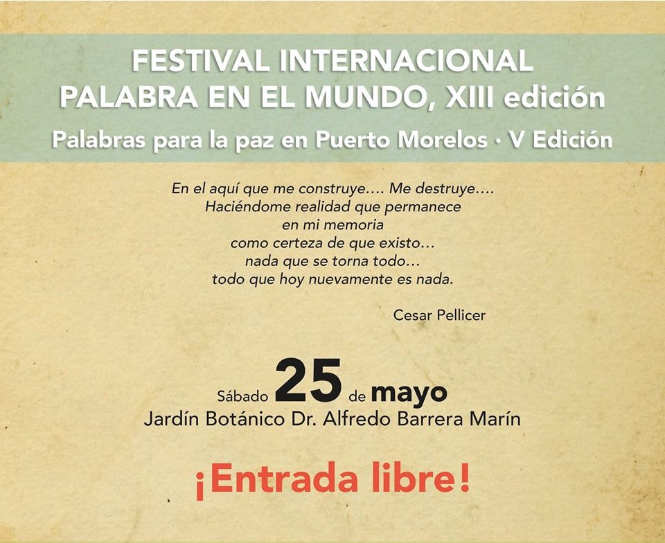 El Jardín Botánico Doctor Alfredo Barrera Marín te  invita al evento en homenaje a César Pellicer poeta puertomorelense. dentro del Festival Internacional “Palabra en el  mundo” palabra para la paz que realizará su quinta edición en Puerto Morelos.