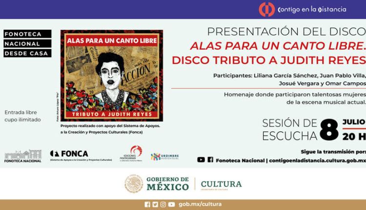 El nuevo disco Alas para un canto libre, que ha sido producido para dar tributo a la memoria de la cantante y luchadora social Judith Reyes, será presentado en la siguiente sesión del ciclo virtual “Fonoteca Nacional desde casa”, el próximo 8 de julio, a las 20 horas.