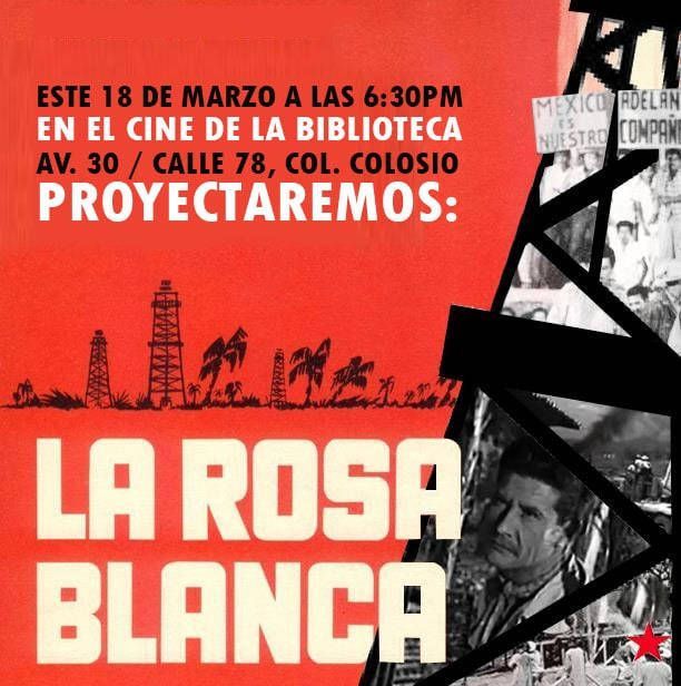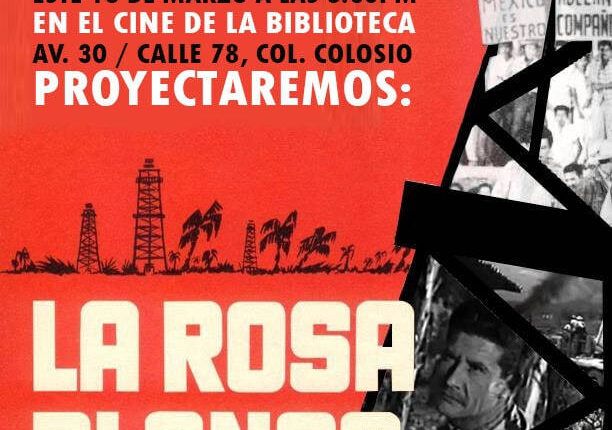 La Rosa Blanca, película censurada durante más de 15 años por retratar los abusos e injusticias cometidas por las compañías petroleras transnacionales, en contra de los intereses de la nación. Basada en la novela de B. Traven, la cinta narra los despojos en contra de los campesinos mexicanos y la especulación financiera.