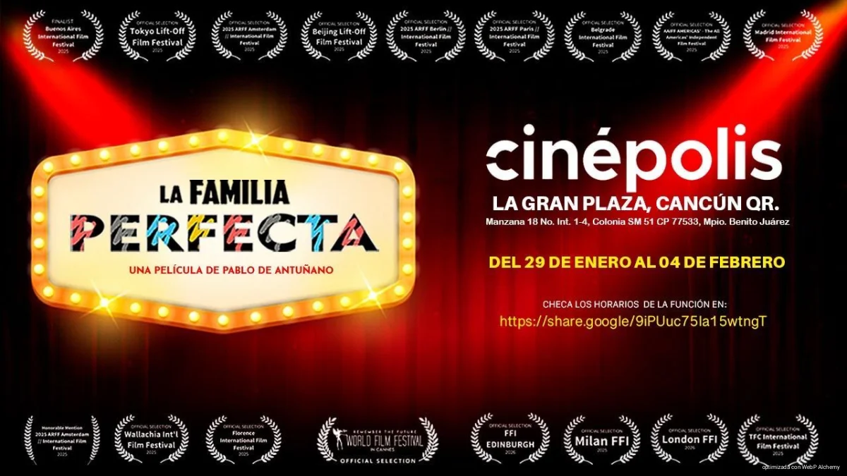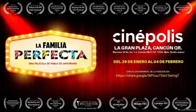 Ciudad de México, enero 15 de 2026.- Después de participar en la ronda 2025 de festivales cinematográficos internacionales por el mundo y obtener 18 reconocimientos y preseas, el largometraje del director mexicano Pablo de Antuñano La Familia Perfecta se exhibirá en el circuito Cinépolis del 29 de enero al 4 de febrero en forma simultánea en salas de Cancún, Guadalajara y la Ciudad de México.