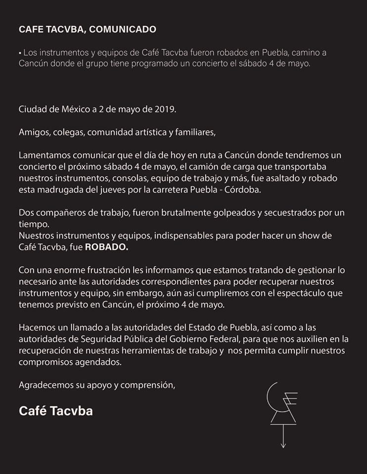 Café Tacvba hizo un llamado a las autoridades de Puebla, así como las autoridades de Seguridad Pública del Gobierno Federal para que los auxilien en la recuperación de sus herramientas de trabajo y les permita cumplir con sus compromisos agendados.