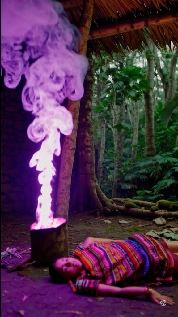 La mujer lanzó puñados de copal al fuego y el humo envolvió a Maricela. El aire se tornó espeso, violeta. Todo se distorsionó. Los insectos en el techo parecían moverse en cámara lenta.
