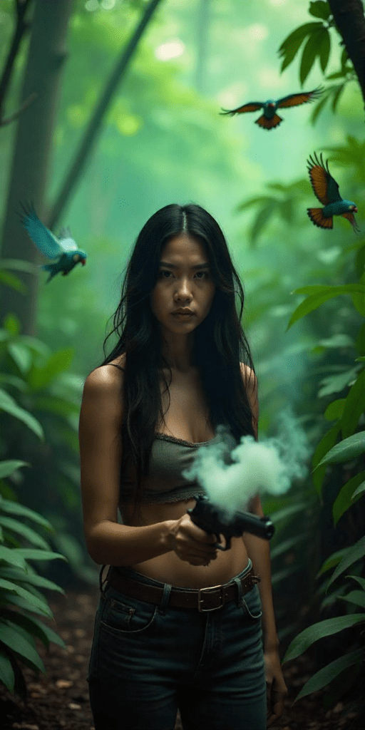 El estruendo desgarró la selva. Cientos de loros y guacamayas alzaron vuelo en estampida, sus graznidos ininteligibles reventando contra las copas de los árboles como cristales rotos.