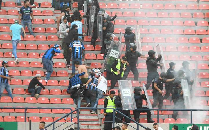 La gresca provocó que cerca de trescientos aficionados queretanos y potosinos que estaban cerca de ellos, se liaron a golpes, lanzando butacas, piedras y hasta los botes de basura, sin que los cuerpos de seguridad pudieran evitarlo.