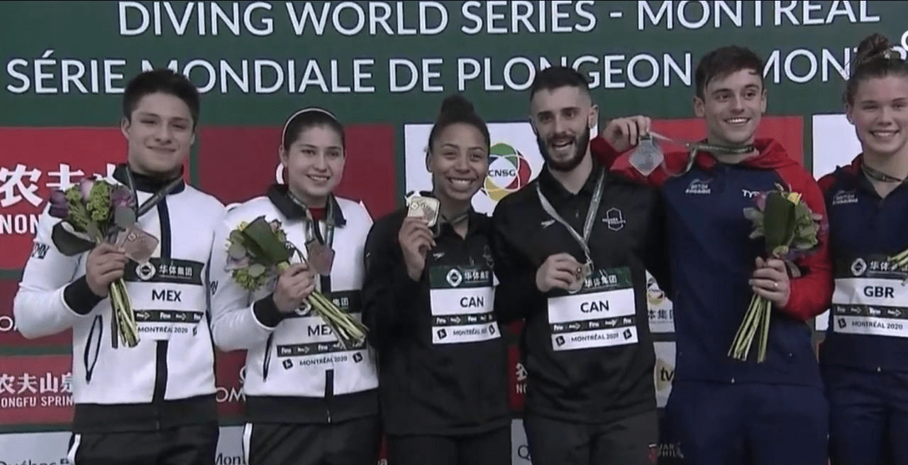 La pareja conformada por Dolores Hernández Monzón y Osmar Olvera Ibarra ganó la presea de bronce, tras sumar 283.20 puntos, en la final de sincronizados mixtos trampolín 3 metros, última competencia de la Serie Mundial de Clavados FINA Montreal 2020, que se realizó en Canadá.