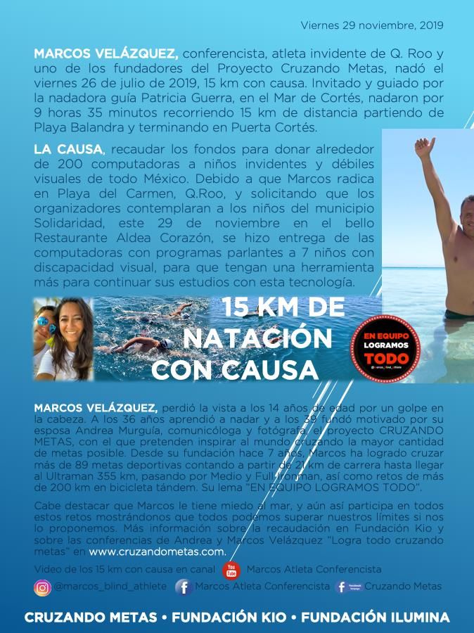 Marcos Velázquez , conferencista, atleta invidente de Q. Roo y uno de los fundadores del Proyecto Cruzando Metas, nadó el viernes 26 de julio de 2019, 15 km con causa. Invitado y guiado por la nadadora guía Patricia Guerra, en el Mar de Cortés, nadaron por 9 horas 35 minutos recorriendo 15 km de distancia partiendo de Playa Balandra y terminando en Puerta Cortés.