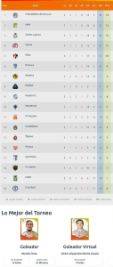 El goleo virtual es liderado por Víctor Dávila del Pachuca, quien ha anotado 9 goles, mientras que Leo Fernández lo secunda con 5.