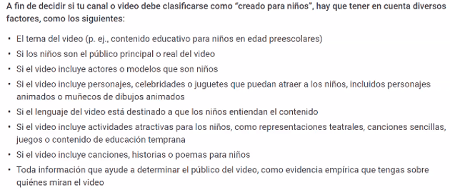 Youtube les pedirá a los creadores de contenido que clasifiquen sus videos y su canal como «no apto para niños» o «apto para niños» basándose en la ley COPPA. En la siguiente imagen te dejamos una lista de lo que la plataforma entiende por «apto para niños»: