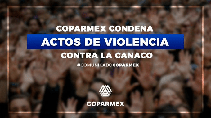 En @Coparmex nos unimos a la preocupación expresada por los organismos de representación empresarial, para condenar los actos de violencia y vandalismo que se han suscitado en los últimos días, entre ellos, el daño a las instalaciones de la @CANACOMexico https://t.co/oPqB1ge1x8 pic.twitter.com/Wufuso79NG