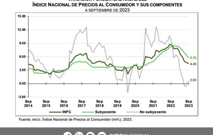 Durante septiembre, la inflación en México mantuvo su ritmo de crecimiento pero a un nivel más lento, el Índice Nacional de Precios al Consumidor (INPC) presentó un incremento de 0.44 por ciento, con lo que la tasa anual se ubicó en 4.45 por ciento, según datos del Instituto Nacional de Estadística y Geografía (Inegi).