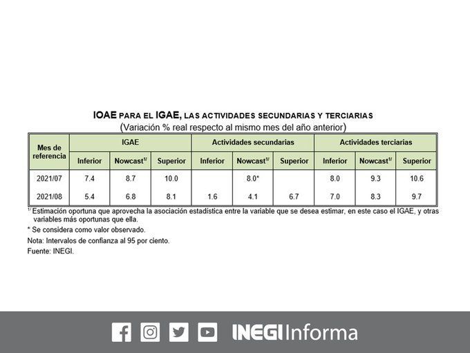 En su indicador oportuno de la actividad económica, se prevé que durante el octavo mes del año el sector industrial se vio afectado en su dinamismo por la tercera ola de COVID, disminuyendo 0.5%; mientras que las actividades del sector servicios y comercio, se estancaron en cero crecimiento.