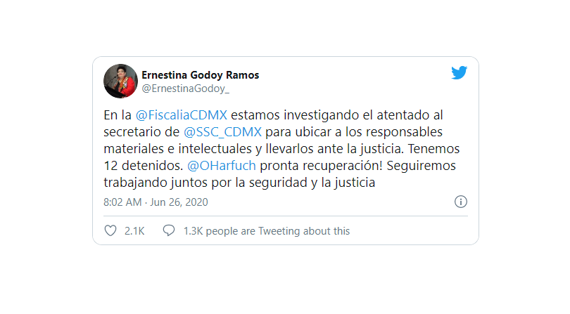 En la @FiscaliaCDMX estamos investigando el atentado al secretario de @SSC_CDMX para ubicar a los responsables materiales e intelectuales y llevarlos ante la justicia. Tenemos 12 detenidos. @OHarfuch pronta recuperación! Seguiremos trabajando juntos por la seguridad y la justicia