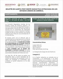 En dicha publicación se adjunto un comunicado, en la que la Conasenusa explica que la Comisión Reguladora Nuclear de los Estados Unidos le reportó el 29 de mayo del extravío de un contenedor de radiografía industrial de marca Industrial, modelo IR-100.