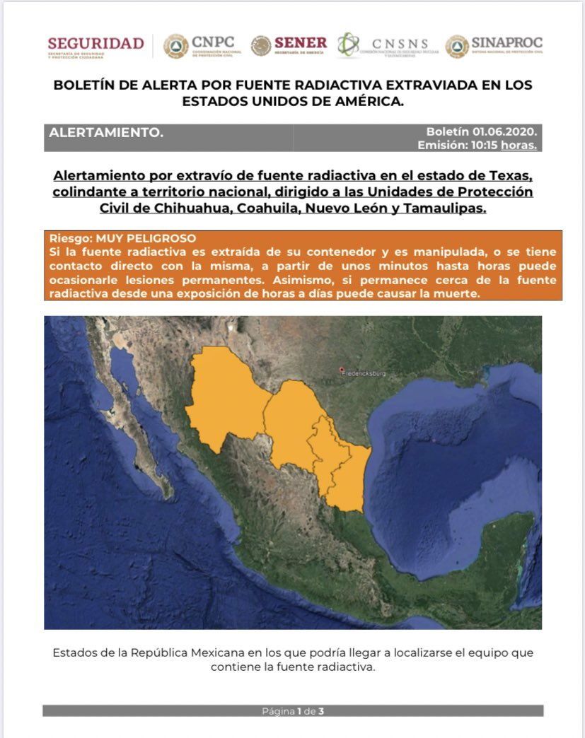 .@CONASENUSA informó el extravió de una fuente radiactiva en📍Texas, Estados Unidos. Aunque es poco probable que la fuente se traslade a territorio nacional, se emite esta información para conocimiento de las autoridades estatales de #ProtecciónCivil y público en general. pic.twitter.com/Y0UStnq0l5