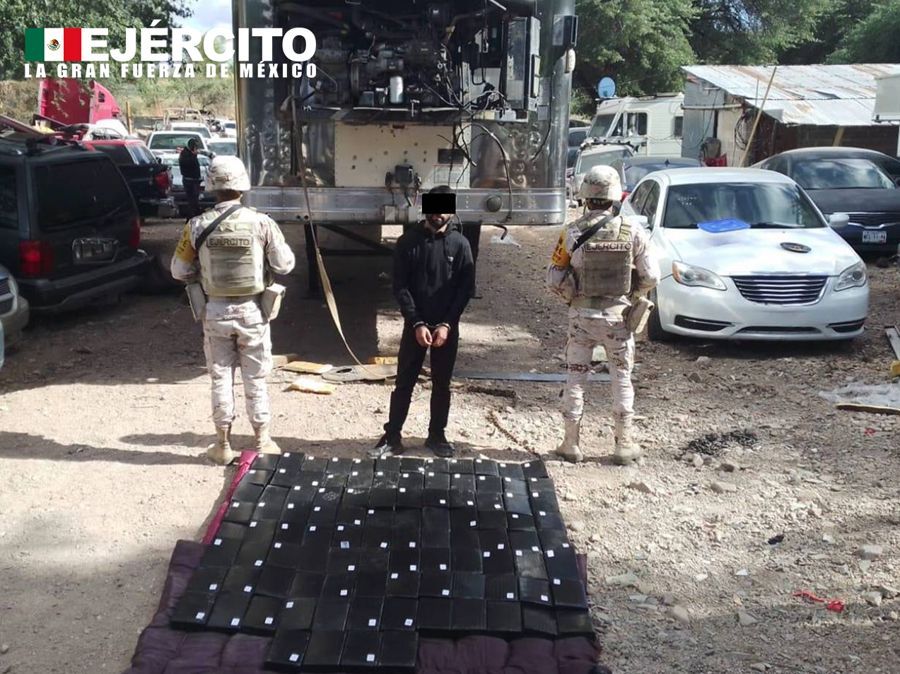 Mediante la revisión a un tractocamión procedente de Culiacán, Sin., con destino a Nogales, Son., personal del Ejército Mexicano en coordinación con la Guardia Nacional localizaron en la caja de refrigeración 100 paquetes que en su interior contenían un polvo blanco con similitudes a la cocaína, con un peso aproximado de 1 kilogramo cada uno.
