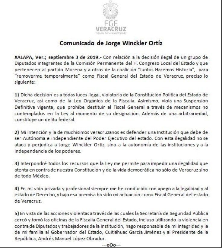 Jorge Winckler Ortiz respondió que su separación del cargo como fiscal de Veracruz es ilegal a todas luces y viola una suspensión definitiva vigente que prohíbe destituirlo a través de mecanismos no contemplados en la ley al momento de su designación.