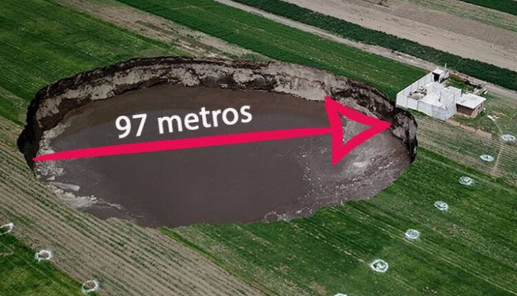En conferencia de prensa la Secretaria de Gobernación, Ana Lucía Hill Mayoral, indicó que el tamaño que ya alcanzó esta cavidad que apareció en los campos de cultivo es de 97 por 78 metros.
