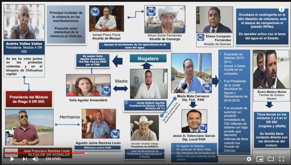 Y es que en la otra diapositiva relativa a políticos del PAN también se observan esos nexos en torno al vital líquido. Ésta inicia con la referencia a Andrés Valles Valles: “presidente del módulo 4 DR [Distrito de Riego] 005, principal incitador de la violencia en las manifestaciones, presunto autor intelectual de la violencia en Delicias”. Y se le vincula con el morenista José Francisco Ramírez Licón, alcalde de Rosales y presidente del módulo de riego 6 DR 005: “se les visto juntos en las protestas violentas y en el bloqueo de Chihuahua capital”.