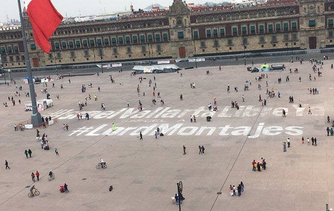 En la plancha del zócalo permanece una enorme pinta exigiendo la libertad de Israel Vallarta y en contra del periodista Carlos Loret de Mola quien participó en el montaje que se realizó hace 16 años para la detención de una supuesta res de secuestradores.