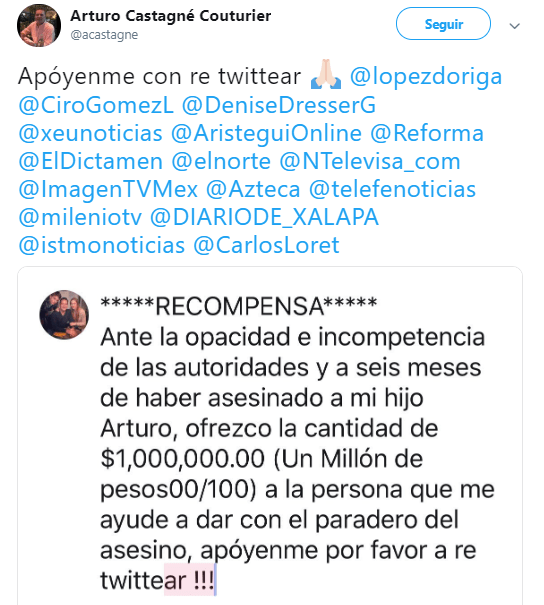 “Ante la opacidad e incompetencia de las autoridades y a seis meses de haber asesinado a mi hijo Arturo, ofrezco la cantidad de $1, 000, 000.00 (Un Millón de pesos 00/100) a la persona que me ayude a dar con el paradero del asesino, apóyenme por favor a retwittear!!!”