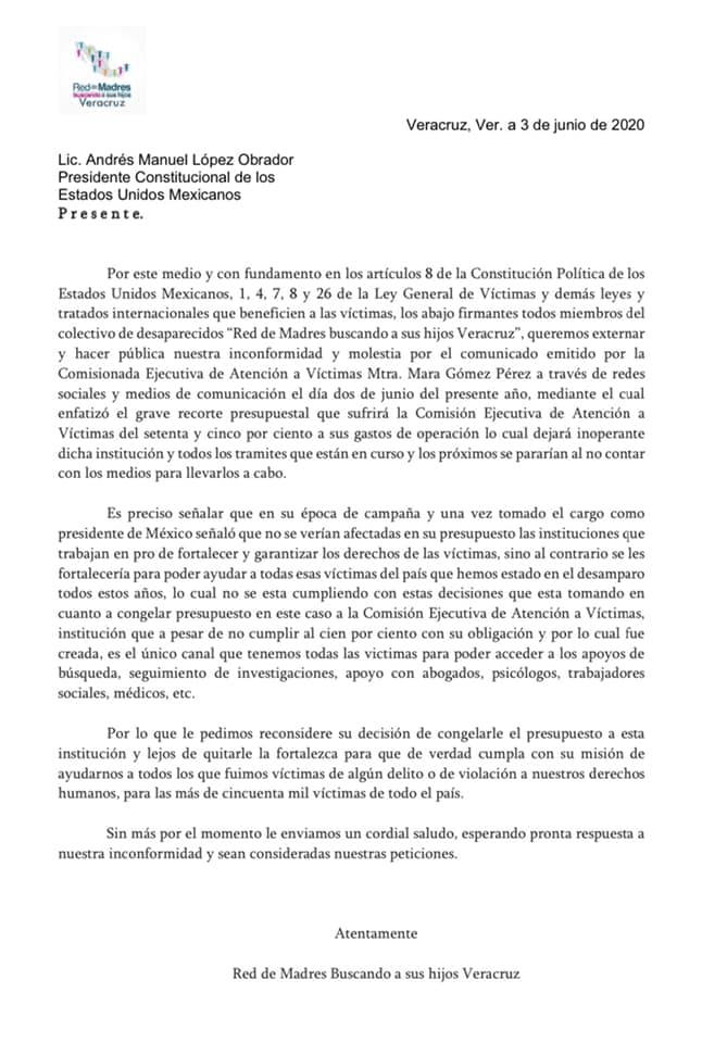 Por este medio y con fundamento en los artículos 8 de la Constitución Política de los Estados Unidos Mexicanos, I. 4. 7. 8 y 26 de la Ley General de Víctimas y demás leyes y tratados internacionales que beneficien a las víctimas, los abajo firmantes todos miembros del colectivo de desaparecidos “Red de Madres buscando a sus hijos Veracruz”, queremos externar y hacer pública nuestra inconformidad y molestia por el comunicado emitido por la Comisionada Ejecutiva de Atención a Víctimas Mtra. Mara Gómez Pérez a través de redes sociales y medios de comunicación el día dos de junio del presente año, mediante el cual enfatizó el grave recorte presupuestal que sufrirá la Comisión Ejecutiva de Atención a Víctimas del setenta y cinco por ciento a sus gastos de operación lo cual dejará inoperante dicha institución y todos los tramites que están en curso y los próximos se pararían al no contar con los medios para llevarlos a cabo.