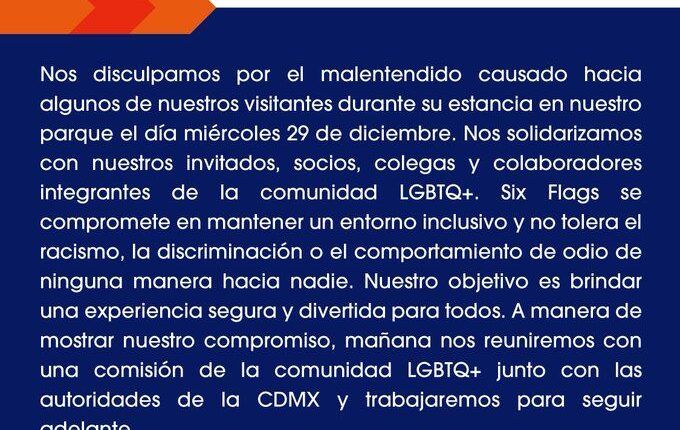 Tras el acto de discriminación a una pareja gay dentro de las instalaciones de Six Flags, el parque de diversiones emitió una disculpa pública y aseguró que se reunirán con una comisión de la comunidad LGBTQ+ y las autoridades de la Ciudad de México, además de comprometerse en mantener un entorno inclusivo.