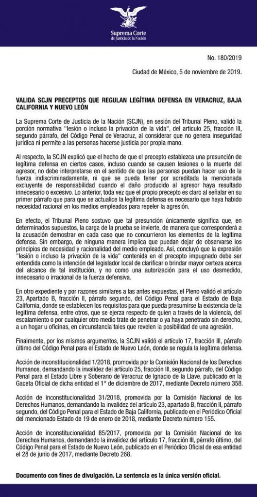 La Suprema Corte de Justicia de la Nación (SCJN) validó la porción normativa “lesión e incluso privación de la vida” en los Códigos Penales de Veracruz, Baja California y Nuevo León en el sentido de que pueda ejercerse una persona ingresa a un hogar u oficinas sin derecho y con la posibilidad de una agresión.