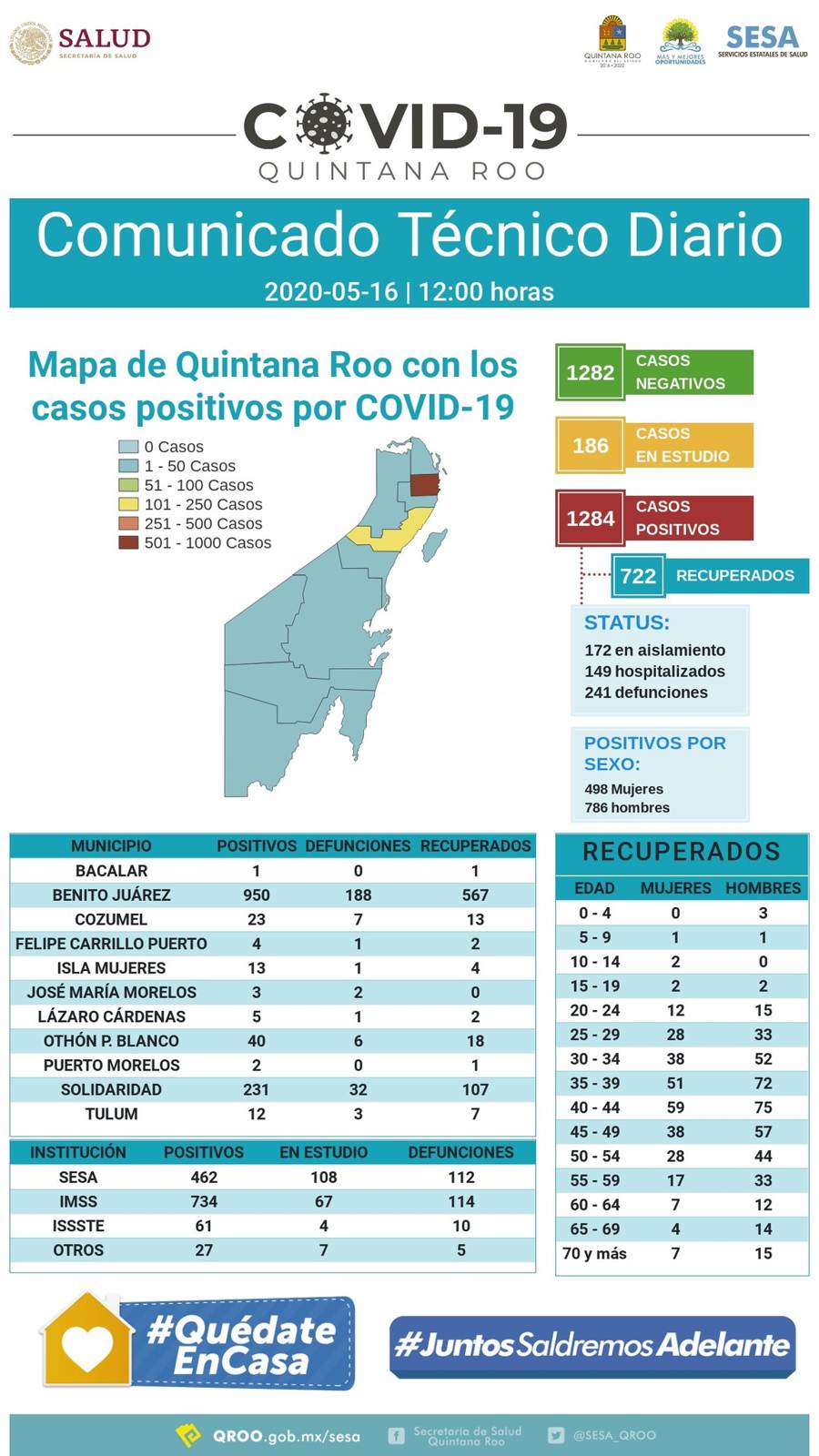 En su informe diario, Alejandra Aguirre, secretaria de salud de Quintana Roo dijo que hasta las 12 horas del 16 de mayo, se han notificado 1282 casos negativos, 186 en estudio, 1284 positivos, 241 defunciones y 722 personas recuperadas a COVID-19; de los cuales 172 se encuentran es aislamiento social, 149 hospitalizados, y se han contabilizado 241 defunciones.