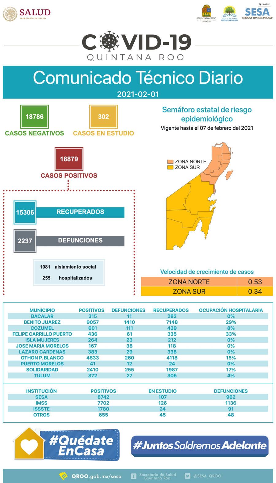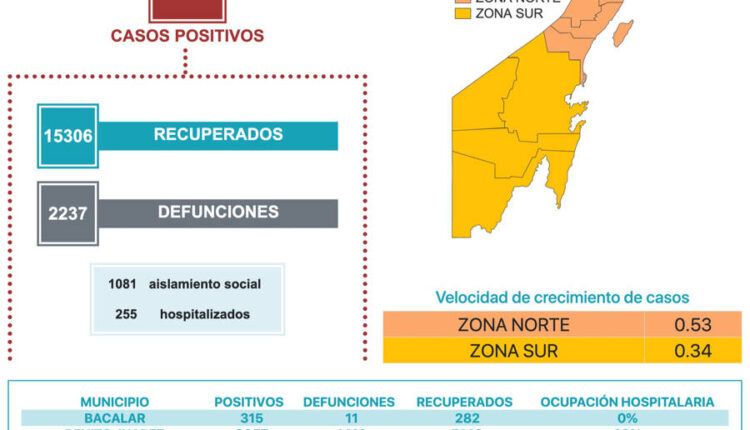 Bacalar acumula 315 casos positivos, Benito Juárez 9057, Cozumel 601, Felipe Carrillo Puerto 436, Isla Mujeres 264, José María Morelos 167, Lázaro Cárdenas 383, Otón P. Blanco 4833, Puerto Morelos 41, Solidaridad 2410 y Tulum 372.