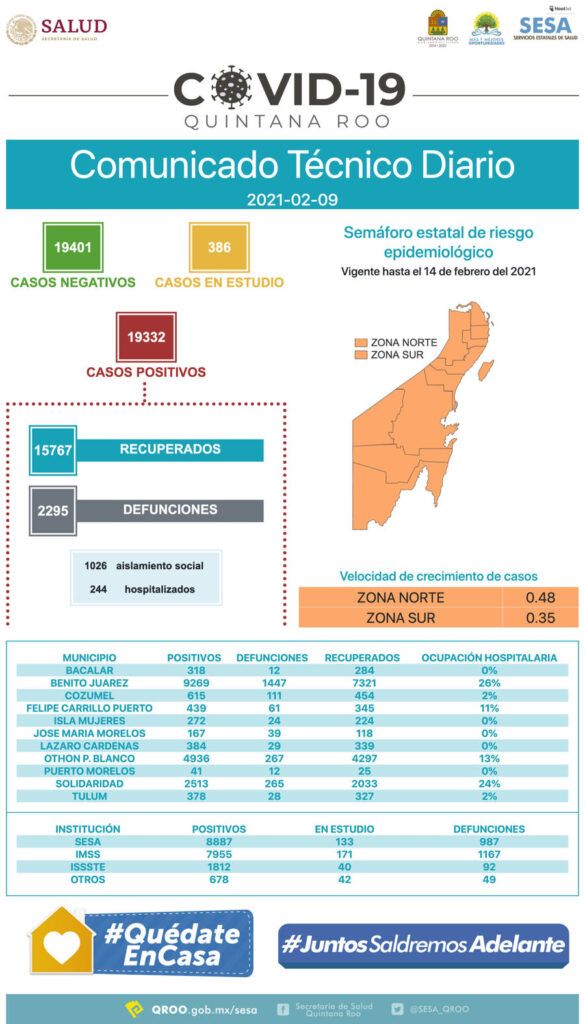 Hasta el 09 de febrero de 2021, se han notificado 2 mil 295 defunciones y 19 mil 332 casos positivos a Covid-19, informó la secretaria de salud en Quintana Roo Alejandra Aguirre.