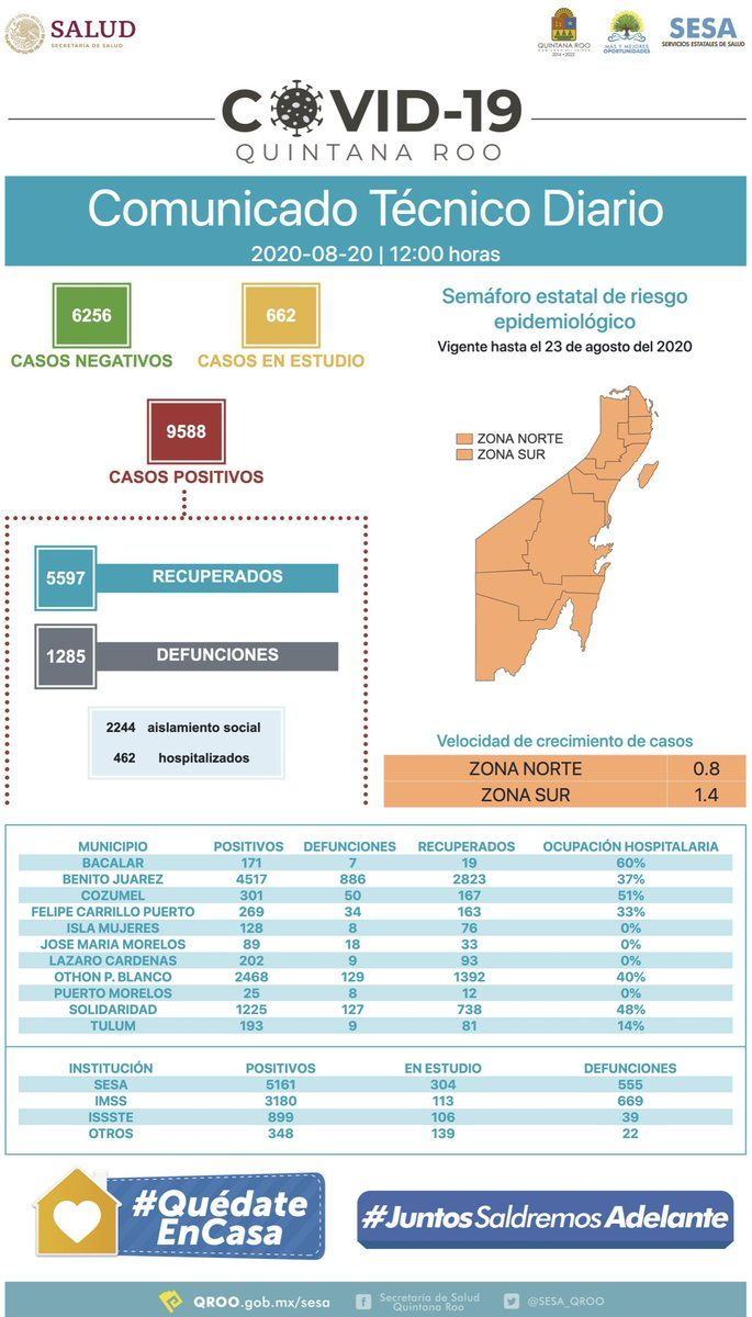 La Secretaría de Salud de Quintana Roo informó que hasta las 12 horas del 20 de agosto, se han notificado 5 mil 597 personas recuperadas, 6 mil 256 casos negativos, 662 casos en estudio, 9 mil 588 casos positivos y mil 285 defunciones relacionadas a COVID-19.