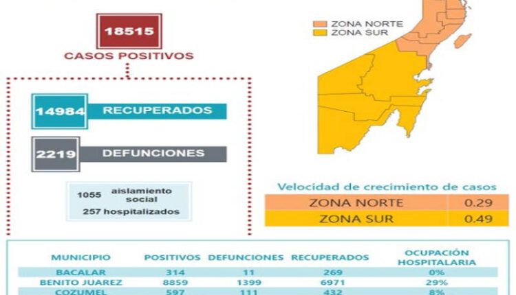 Bacalar acumula 314 casos acumulados, Benito Juárez 8859, Cozumel 597, Felipe Carrillo Puerto 429, Isla Mujeres 258, José María Morelos, Lázaro Cárdenas 382, Othón P. Blanco 4775, Puerto Morelos 41, Solidaridad 2334, y Tulum 359.