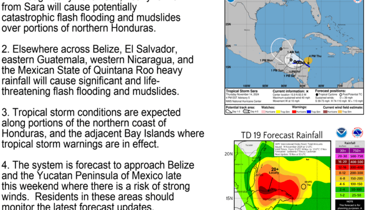 La tormenta tropical Sara, formada en el Caribe, amenaza con causar lluvias intensas y condiciones peligrosas en varios países de Centroamérica y el sur de México. El Centro Nacional de Huracanes de Estados Unidos ha emitido advertencias ante la posibilidad de inundaciones catastróficas y deslizamientos de tierra, especialmente en Honduras.