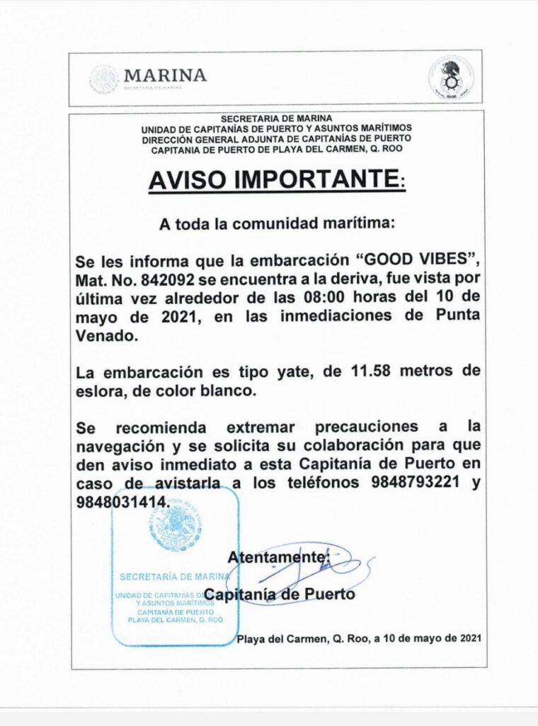 La capitanía de Puerto en Playa del Carmen emitió un aviso de seguridad a todas las embarcaciones que navegan en la zona de Punta Venado ya que un yate llamado “Good Vibes” de 11.58 metros se encuentra pedido a la deriva.