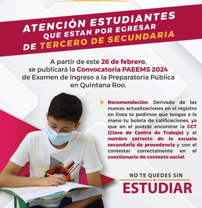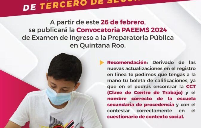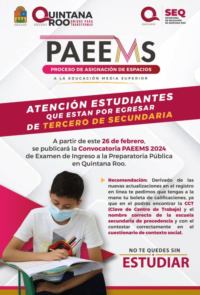 A partir de este 26 de febrero, las y los interesados en continuar sus estudios de preparatoria, podrán consultar las bases para participar en el Proceso de Asignación de Espacios a la Educación Media Superior “PAEEMS” 2024, así como los requisitos, el proceso del registro en línea, criterios de asignación, fechas del examen y de resultados, a través de la convocatoria que se publica en https://paeems.seq.gob.mx/.