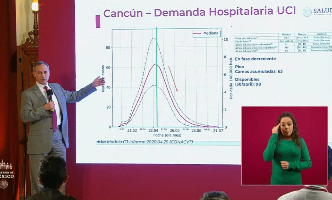 El subsecretario de Salud, Hugo López Gatell informó que, para Cancún el número más alto de casos estaba previsto para fines de abril, por lo que estimó que el destino podría salir pronto de la epidemia.