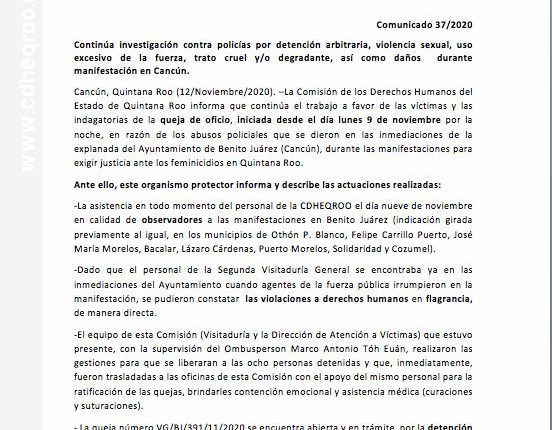 La Comisión de los Derechos Humanos del Estado de Quintana Roo informa que continúa el trabajo a favor de las víctimas y las indagatorias de la queja de oficio, iniciada desde el día lunes 9 de noviembre por la noche, en razón de los abusos policiales que se dieron en las inmediaciones de la explanada del Ayuntamiento de Benito Juárez (Cancún), durante las manifestaciones para exigir justicia ante los feminicidios en Quintana Roo.