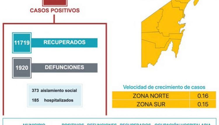 Bacalar tiene 273 casos positivos, Benito Juárez 6621, Cozumel 485, Felipe Carrillo Puerto 372, Isla Mujeres 224, José María Morelos 150, Lázaro Cárdenas 331, Othón P. Blanco 3656, Puerto Morelos 32, Solidaridad 1761, Tulum 292.