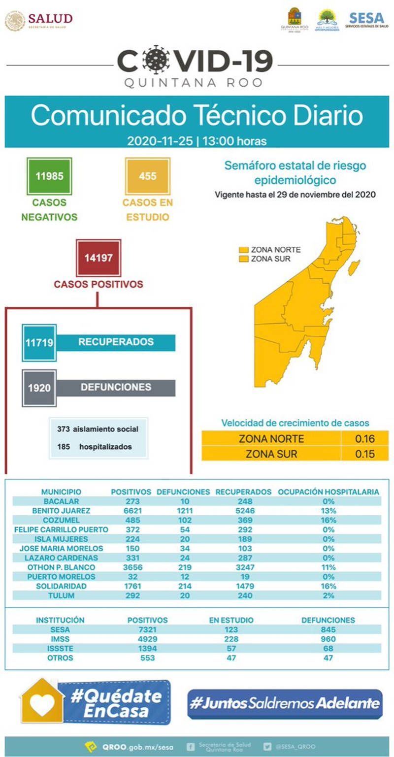 Hasta las 13 horas del 25 de noviembre, se han notificado 11 mil 719 personas recuperadas, 11 mil 985 negativos, 455 casos en estudio, 14 mil 197 casos positivos y mil 920 defunciones relacionadas a COVID-19. Así lo informó la secretaria de Salud en el estado Alejandra Aguirre.