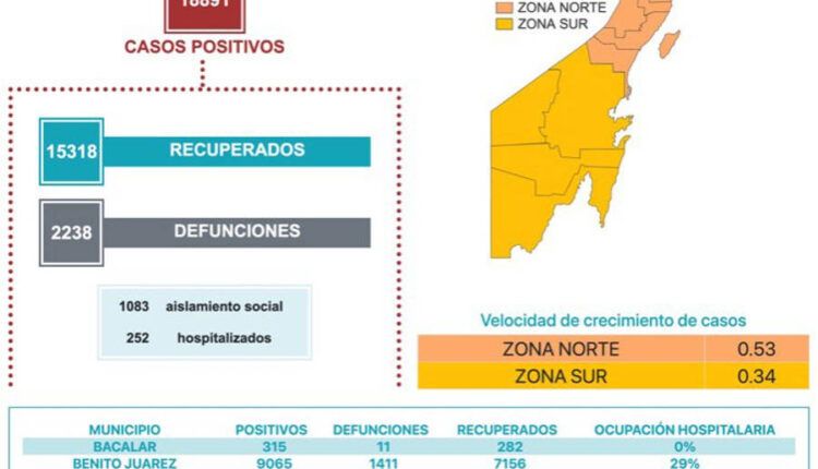 Bacalar cuenta con 315 casos positivos, Benito Juárez 9065, Cozumel 602,Felipe Carrillo Puerto 436,Isla Mujeres 264, José María Morelos 167, Lázaro Cárdenas 383, Othón P. Blanco 4835, Puerto Morelos 41, Solidaridad 2411 y Tulum 372.