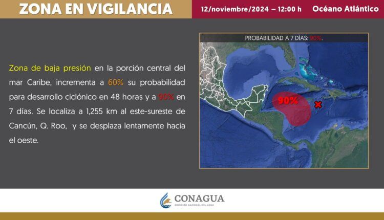 “Quintanarroenses, la zona de baja presión que vigilamos en la porción central del mar Caribe incrementó a 60% su probabilidad para desarrollo ciclónico en 48 horas y a 90% en 7 días”, compartió la mandataria. El sistema se localiza a aproximadamente 1,255 km al este-sureste de Cancún y se desplaza lentamente hacia el oeste.