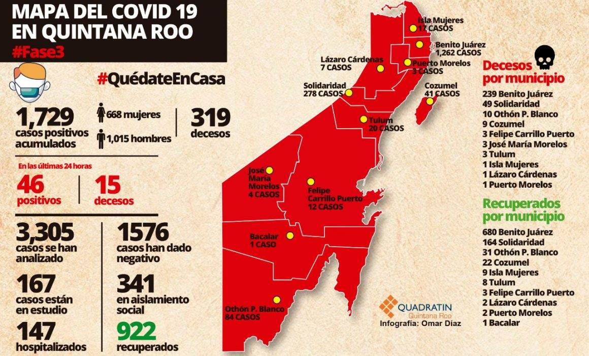 Quintana Roo acumuló en 24 horas, 15 muertes por Covid 19 y 46 casos positivos, informó este miércoles 27 de mayo la Secretaría de Salud estatal. En total el estado acumula 319 decesos y mil 729 contagios, de los cuales 688 son mujeres y mil 41 hombres.