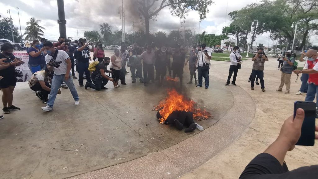 Los manifestantes se trasladaron hasta Palacio de Gobierno donde quemaron unas botargas con los rostros del gobernador Carlos Joaquín González como de Alberto Capella.